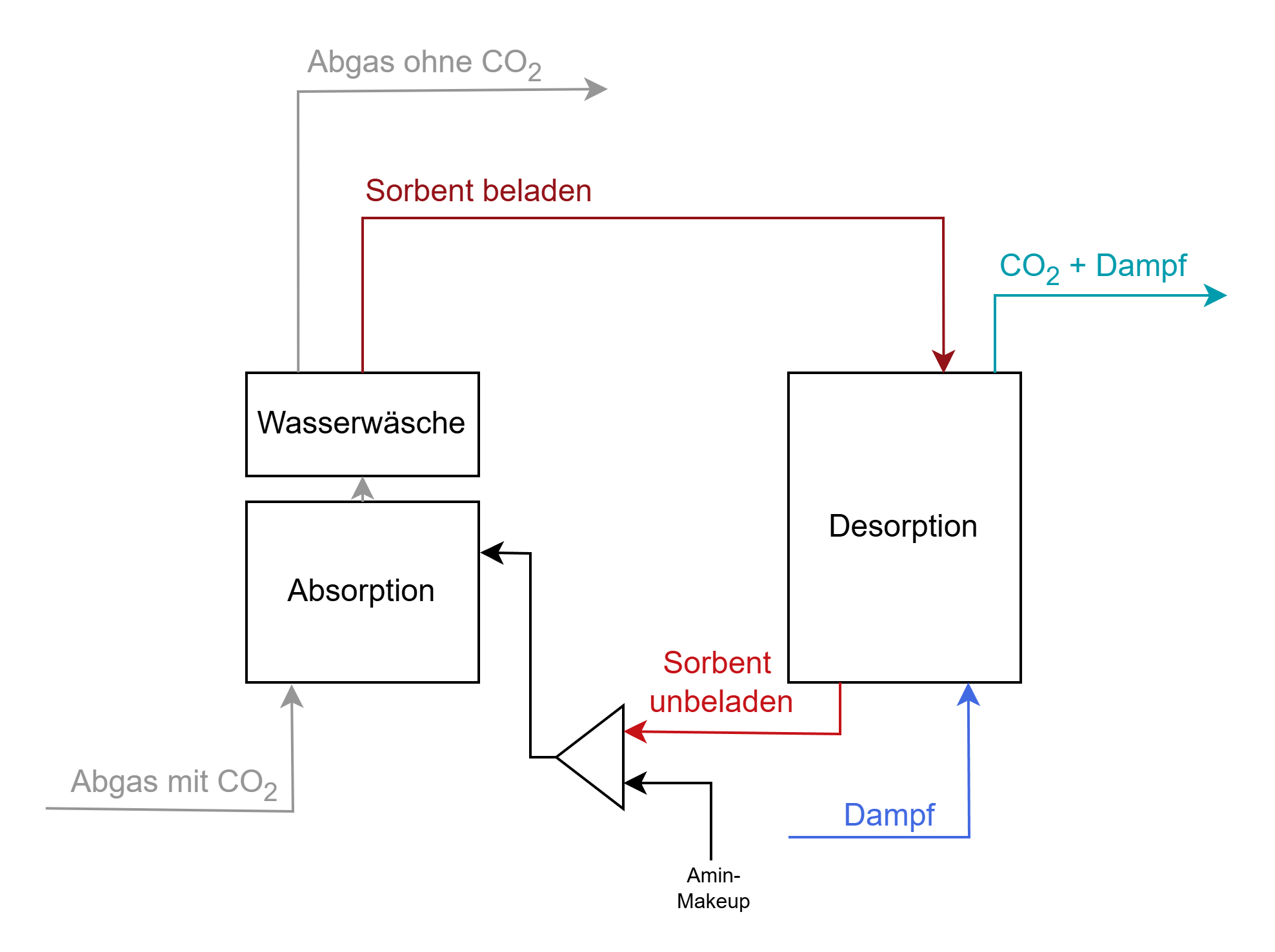 As shown in the illustration, the plant primarily consists of two units – the absorber, whereCO2 is absorbed from the acidic exhaust gas, and the stripper, where theCO2 is desorbedat higher temperatures and then liquefied for further use. The advantage of amine scrubbing is the maturity of the technology and the high separation rate, while the disadvantage is the high energy requirement to achieve high purity levels. [1], [2], [3]