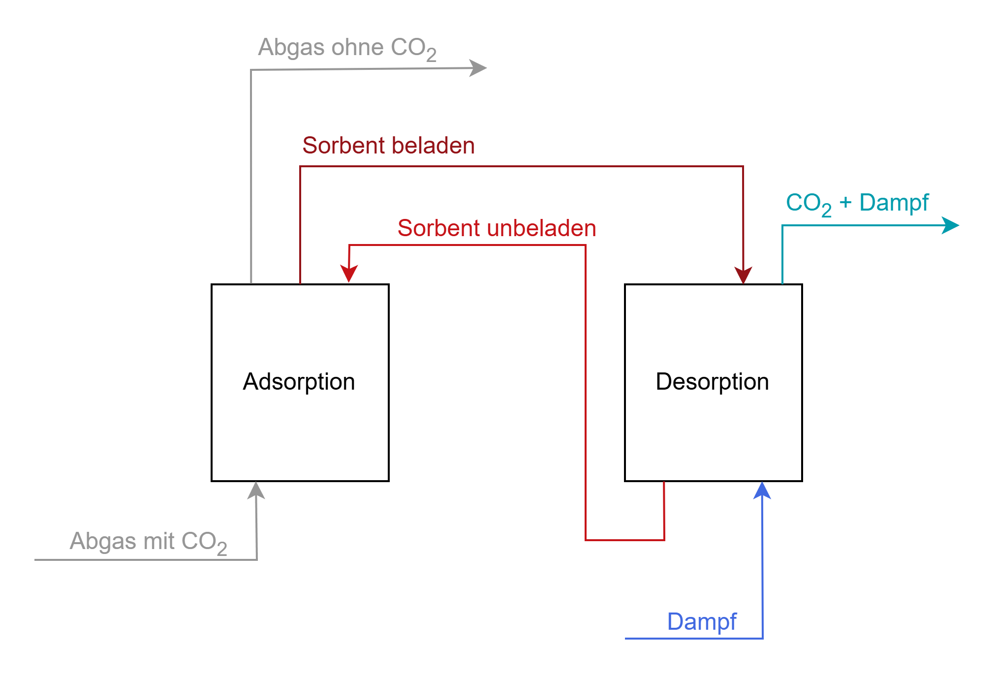 The following figure shows the main material flows of a multi-stage TSA fluidized bed system consisting of two units as an example of an adsorption process. In the adsorber (left), the carbon dioxide binds to the particles, which are then conveyed to the desorber (right). There, the